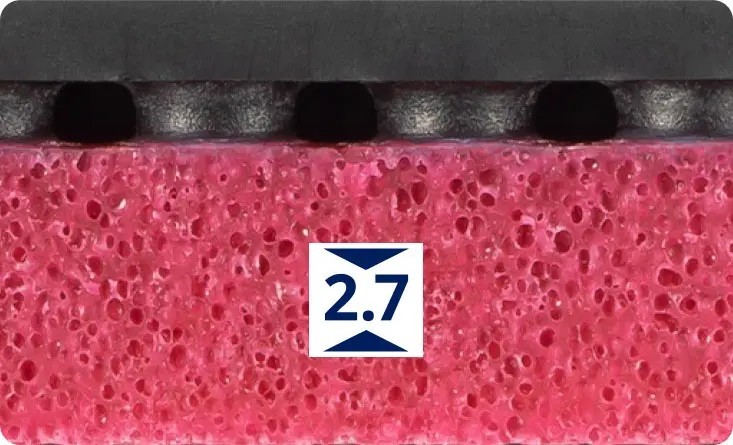 Zyre 03 的設計將較薄的面膠(通常密度更高、更重)與較厚的海綿(由密度較低的充氣橡膠材料製成)相結合。因此,整體膠皮保持了相對較低的硬度,重量也更輕。事實上,海綿厚度為 2.7 的 Zyre 03 僅比 Dignics 05(2.1)重約 1 克*,比 Dignics 09C(2.1)輕約 2 克。這有助於防止因膠皮重量過重而導致揮拍速度下降,同時也能保持底板組合的彈性。