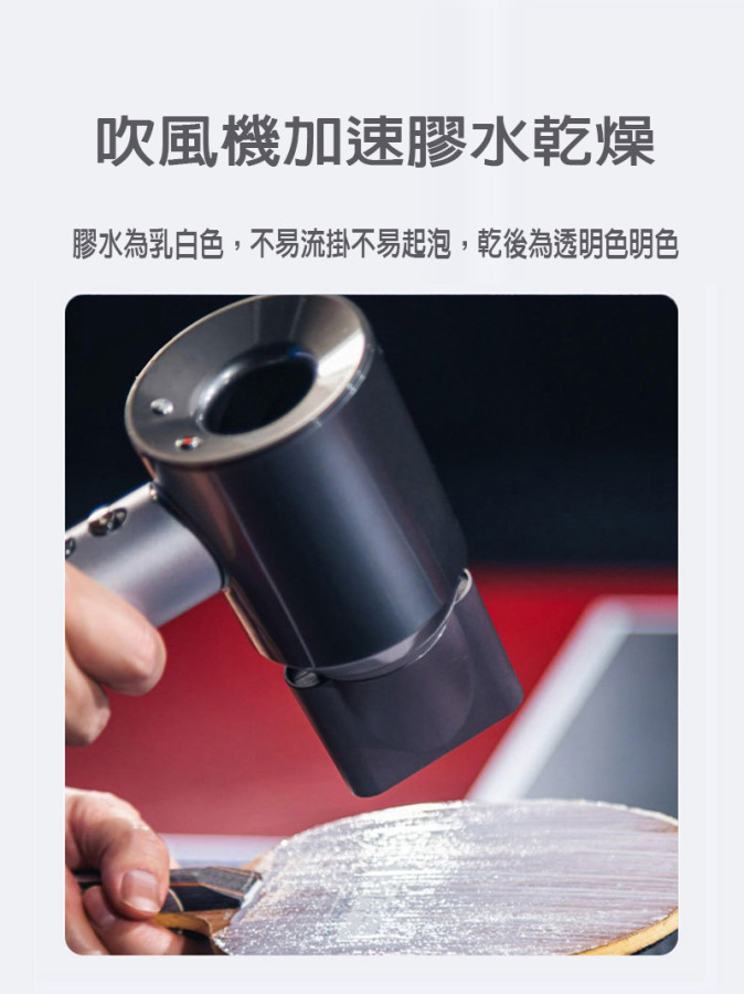 ●要縮短貼膠時間,可用吹風機吹風加速乾燥時間,拍面及膠面吹風至乾燥成透明狀後即可貼合。