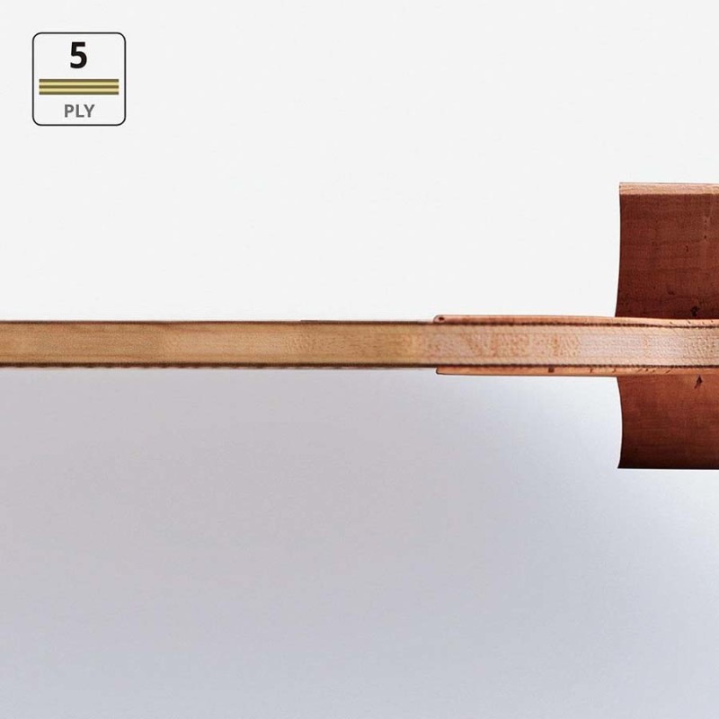 兼有ARYLATE纖維黏著柔性及CARBOM高彈性之混合特性 之五夾碳纖板,獨特之拍型結構,為前陣攻守特別設計開發,推擋時能吸收來球之衝擊,攻擊時又能打出快速之前衝球,是一隻很理想的反轉用球拍。